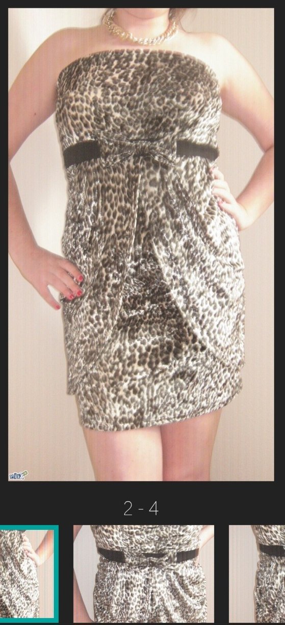 Bu dar kesim mini elbise, drapeli tasarımı ve askısız, ince askılı kolları ile dikkat çeker. Sentetik kumaştan yapılmış, kahverengi ve gri tonlarda cesur leopar desenine sahiptir, partiler için uygundur.