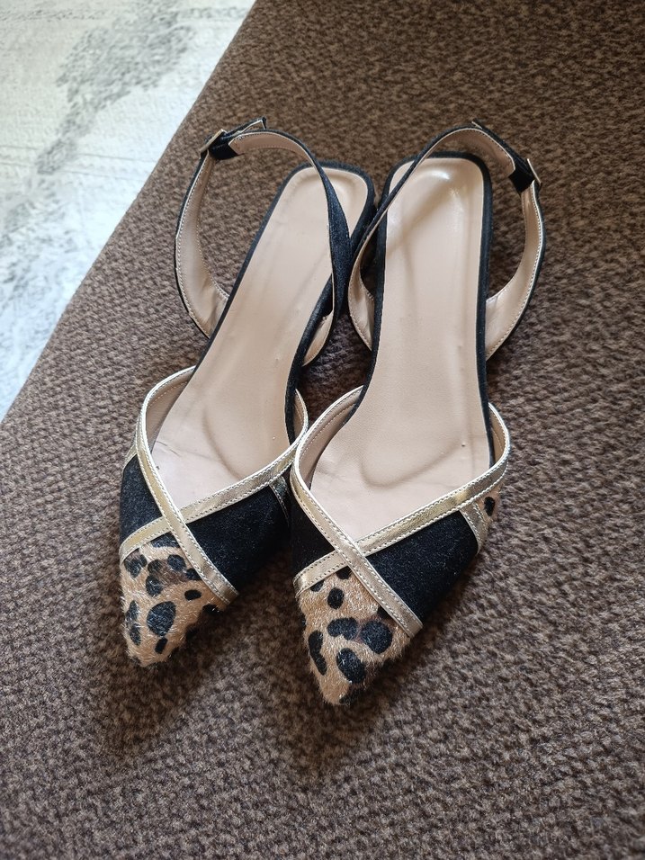 Kahverengi süet malzemeden, leopar desenli ve kürk detaylı stiletto topuklu ayakkabılar. Slingback modeliyle klasik zarafet sunar. iki kere giydim ayakkabiyi kalibi cok rahattir uzun sure giydim tüm gün ayağımı hiç acitmadi hem şık hem kaliteli alıcısına şimdiden hayırlı olsun