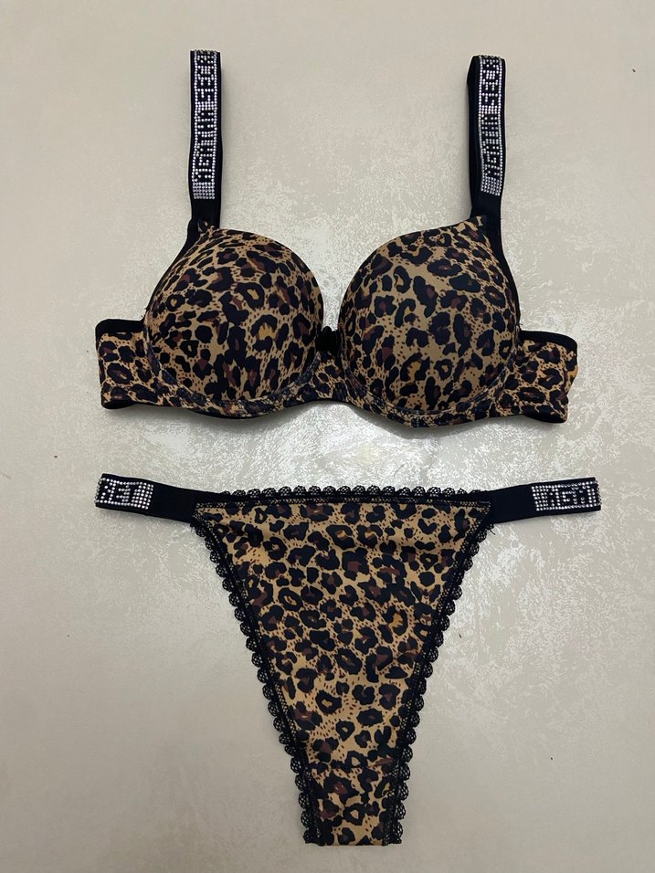Leopar desenli, siyah dantel detaylı sütyen ve tanga, markalı askılarla şık ve iddialı bir sokak modası tarzı sunar. Agatha secret bedenleri mevcuttur istediğiniz bedende ilan açtırabilirsiniz 75/80/85 vardır