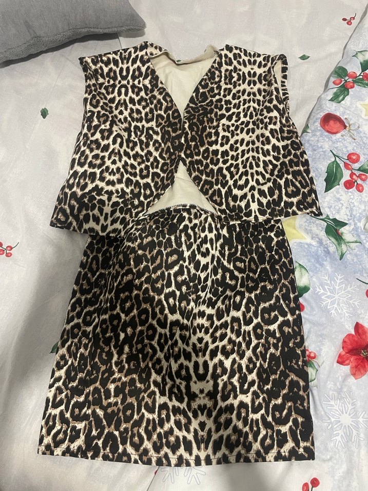 Leopar desenli, kahverengi tonlarında, fırfır detaylı kedi kıyafeti. Sokak tarzı için uygundur.
