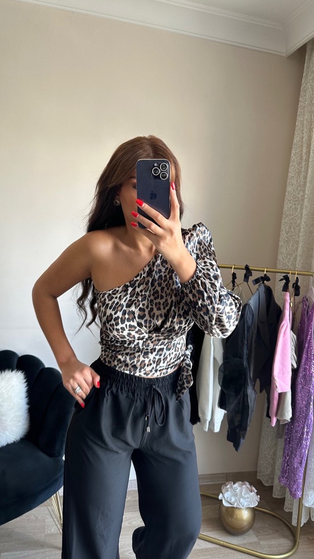 Leopar Desenli Tek Omuzlu Bluz