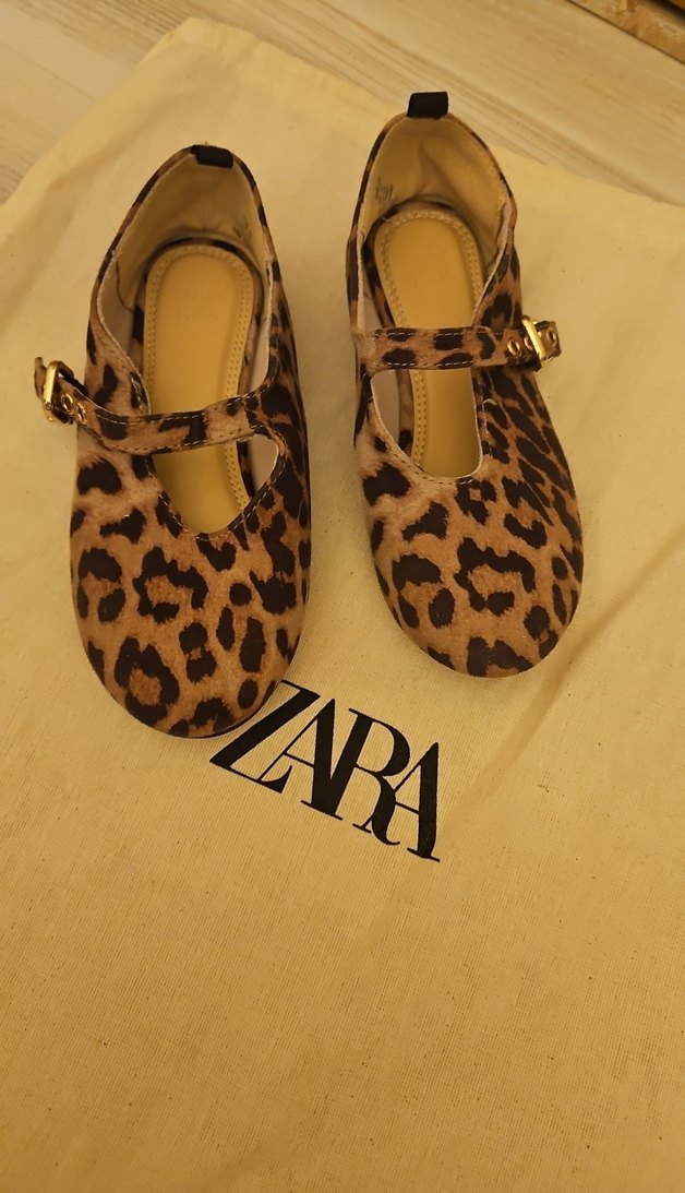 Kahverengi leopar desenli, tokalı bantlı ve ince topuklu kız çocuk düz ayakkabı. Günlük sokak stili için uygundur. 2 kez giyildi, yeniden farksız