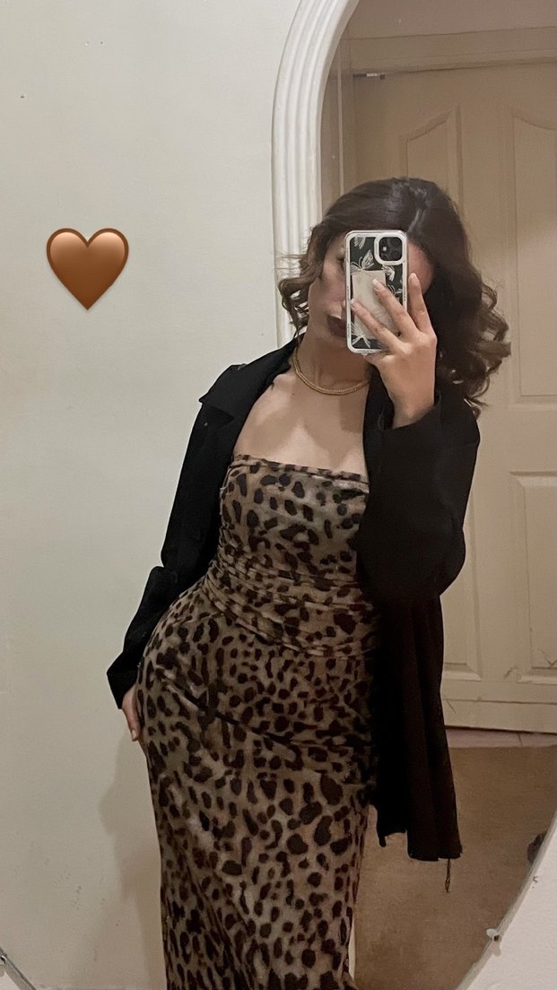 Pinterest takım. Kahverengi, leopar desenli, straplez, transparan kollu, midi boy, vücuda oturan elbisedir.