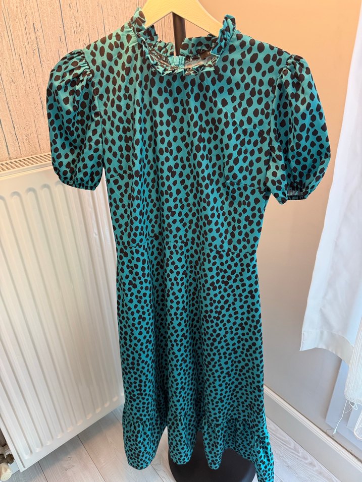 Kısa balon kollu, yüksek yakalı, volan detaylı turkuaz midi elbise, koyu leopar desenli ve salaş kesim, romantik akşamlar için uygun.