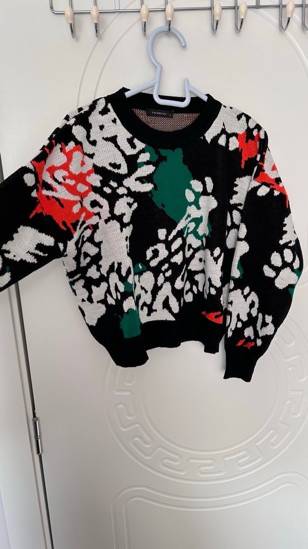 Kadınlar için desenli, uzun kollu ve yuvarlak yakalı örgü mini kazak. Gevşek kesimi ve koyu renkli çok renkli deseniyle rahat ve sokak modası tarzında, günlük kullanım için uygundur.