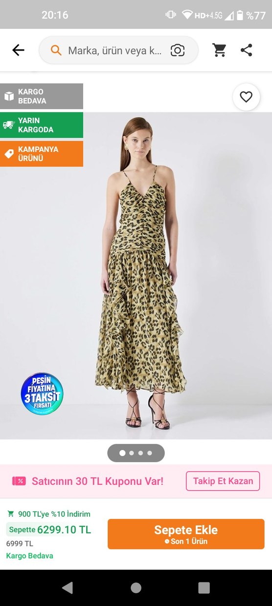 Bej renkte, leopar desenli uzun elbise, askılı ve drapeli tasarıma sahiptir. Rahat kesimi ve yumuşak sentetik kumaşıyla romantik akşamlar için uygundur.