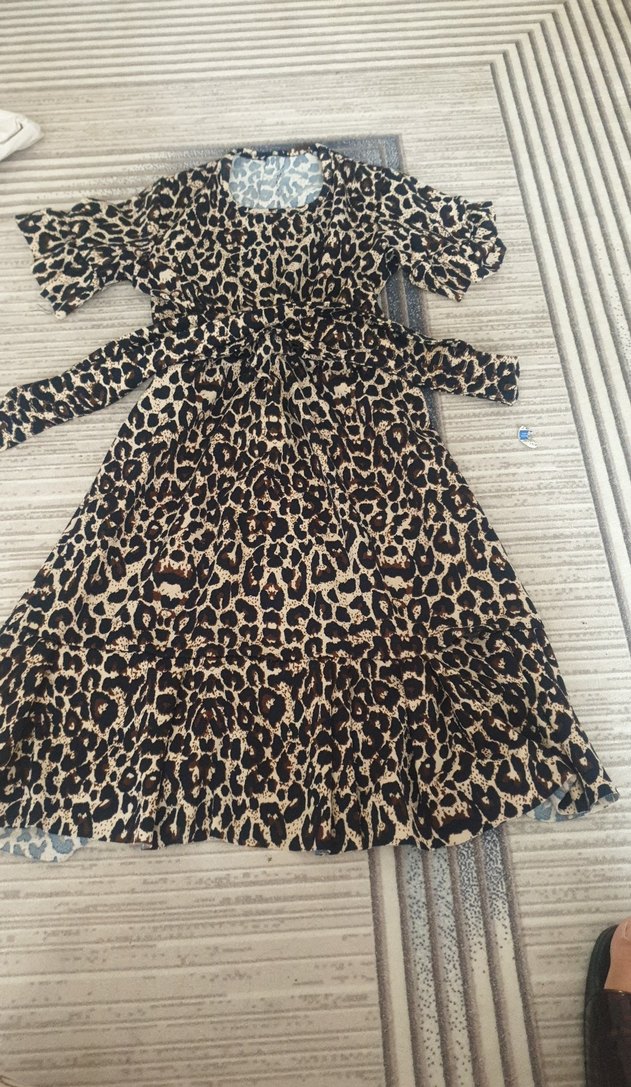 Leopar desenli, uzun ve bol kesim kahverengi elbise. Fırfır detaylı, askılı kollu ve yuvarlak yakalı bohem tarzda. Günlük kullanım için uygun.