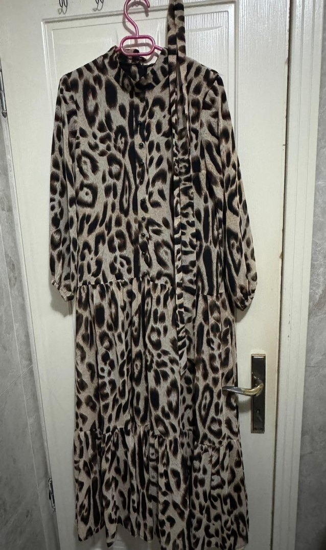 Leopar desenli, kürk detaylı, yüksek yakalı uzun kadın elbisesi. Uzun kollu ve bol kesim, yumuşak şifon kumaştan, kahverengi ve gri tonlarda. Bohem tarz için uygundur. 44 bedene de uygundur
