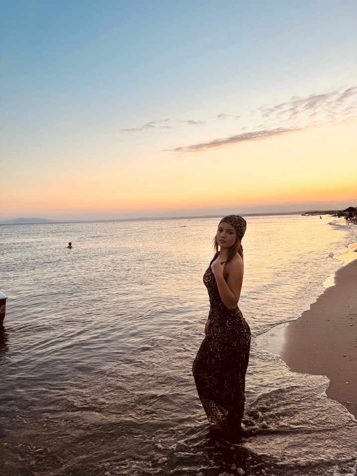 Lacivert leopar desenli, askılı, uzun ve drapeli monokini. Fitted kesim ve bohem tarzıyla cesur plaj görünümü sunar.