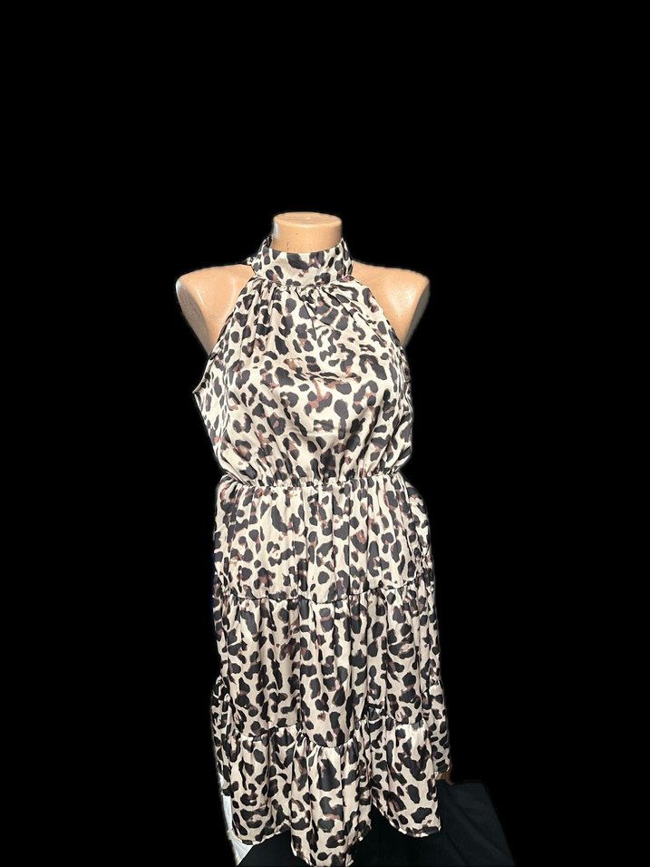 Kolsuz, uzun boyun halter yaka, bol kesim ve drapeli tasarıma sahip elbise. Açık kahverengi leopar desenli, yumuşak sentetik kumaştan, sokak modasına uygun.