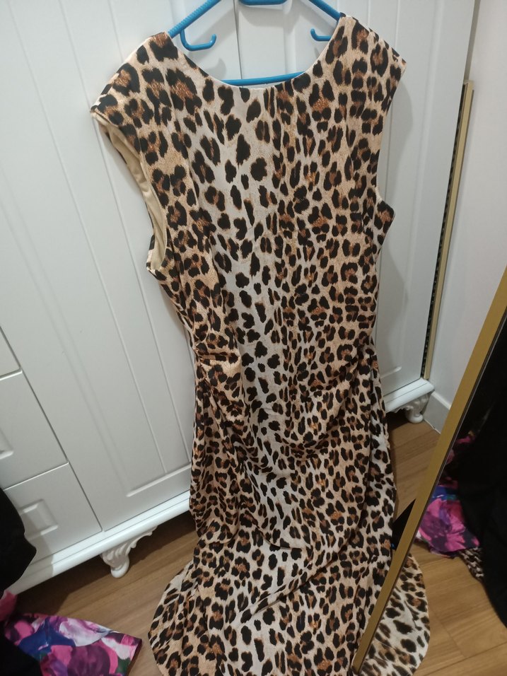 Leopar Desenli Uzun Drapeli Elbise