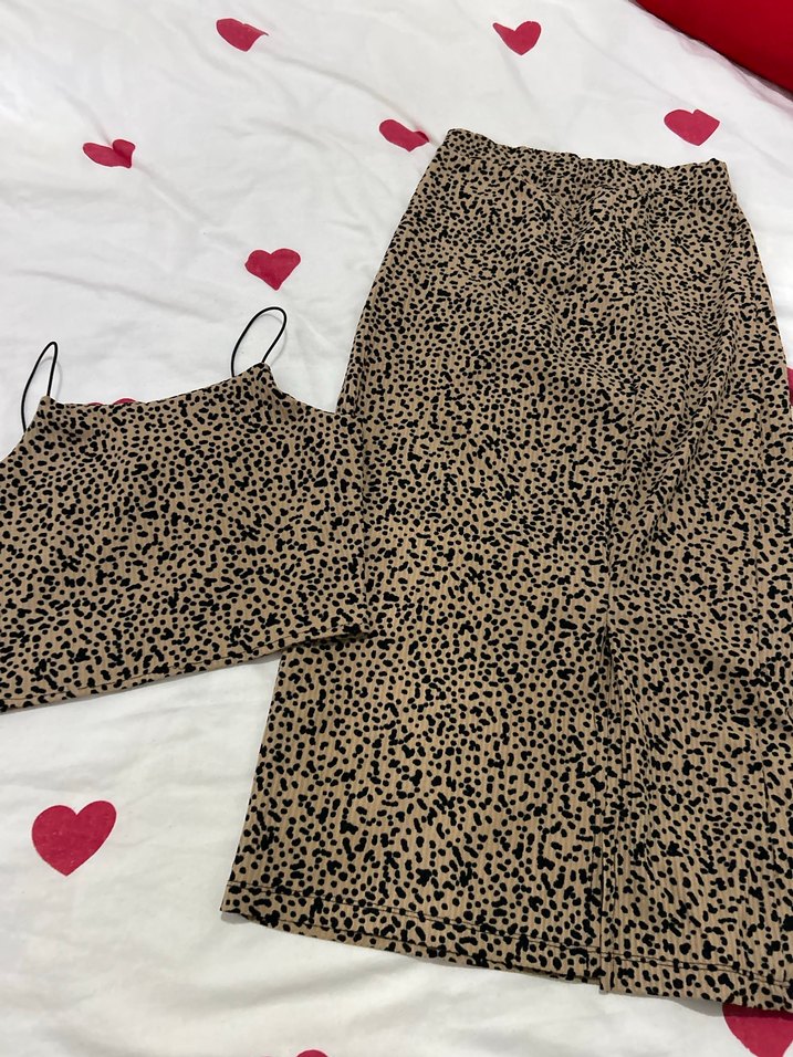 Kahverengi uzun ikili takım , drapeli detaylı, leopar desenli ve sentetik kumaştan, trend sokak modasına uygun rahat bir tasarımdır.