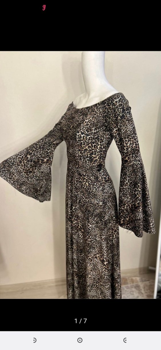 Drapeli kayık yaka ve uzun, geniş kollara sahip kahverengi leopar desenli uzun elbise. Rahat kesimli, romantik akşamlar için ideal.kadifedir kumaşı ağırdır beden hiç uymadığı için iade süresi dolduğu için hiç giyilmedi