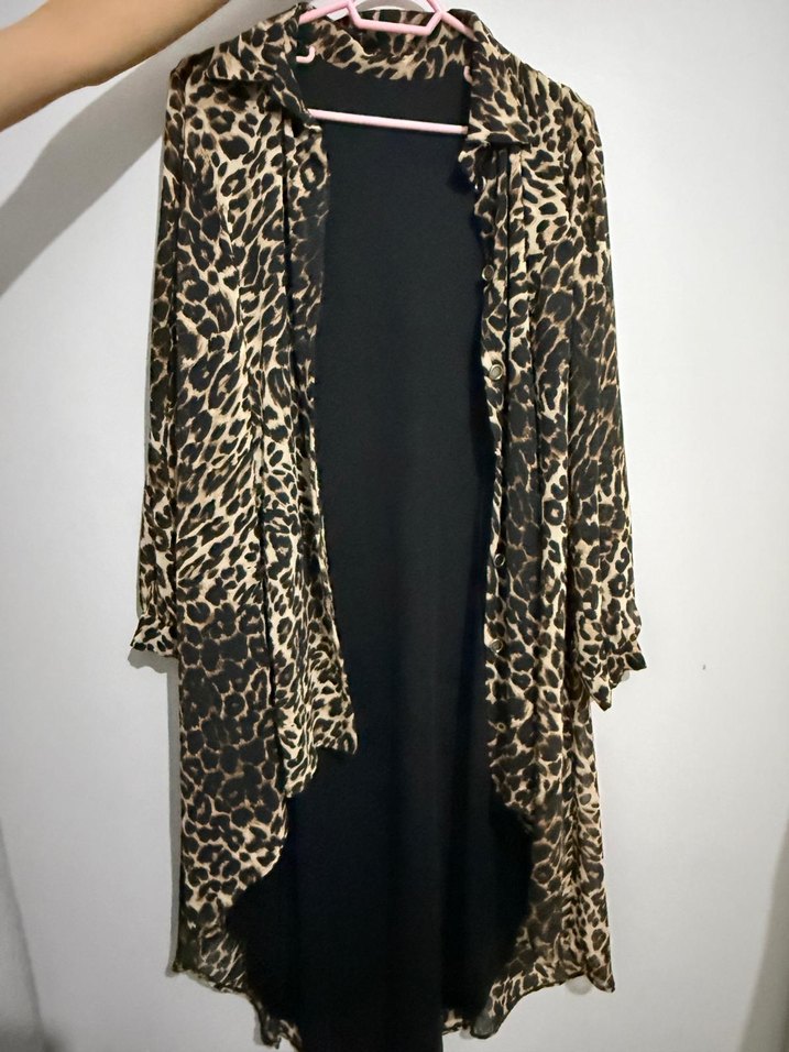 Koyu kahverengi leopar desenli, uzun, bol kesim ve drapeli hamile ceketi. Uzun kollu, yüksek yakalı ve yumuşak sentetik kumaştan yapılmıştır.