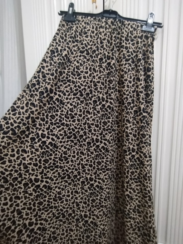 Sentetik kumaştan, leopar desenli uzun ve dökümlü, bol kesim kadın etek. Koyu kahverengi tonlarıyla dış mekan sokak stiline uygun, bohem ve rahat bir parça.