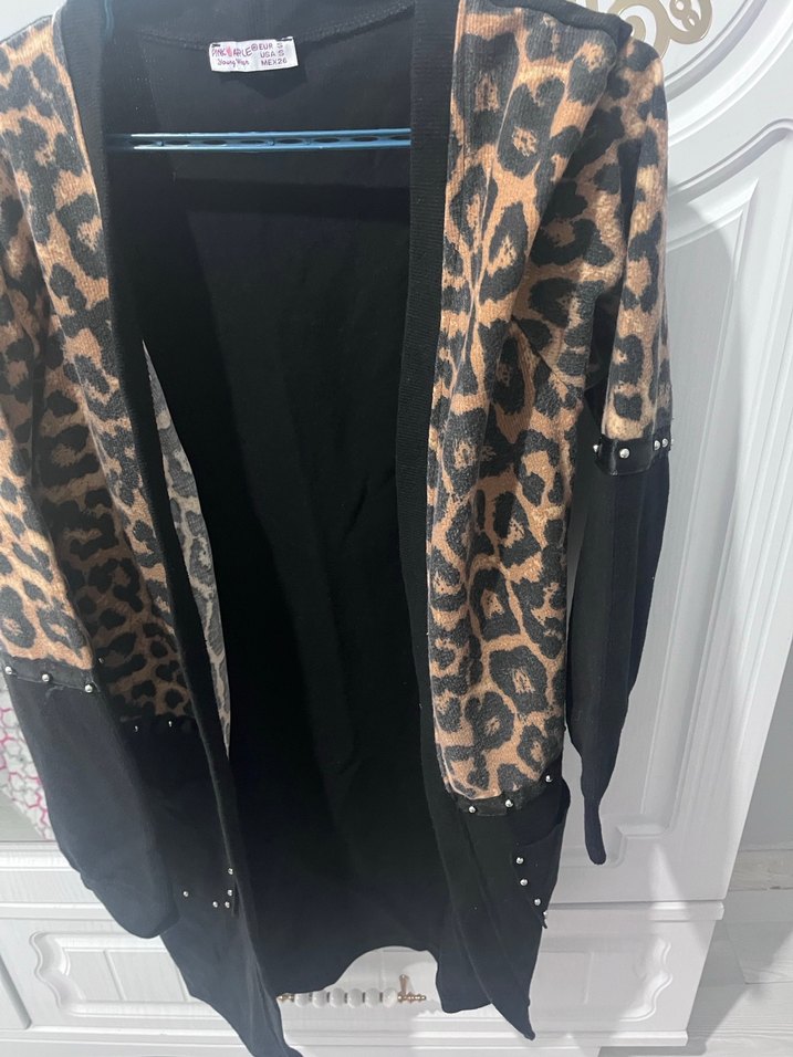 Leopar desenli, kürklü detaylı, uzun ve dar kesim kadın hırka, koyu kahverengi sentetik kumaştan, notched yakalıdır.