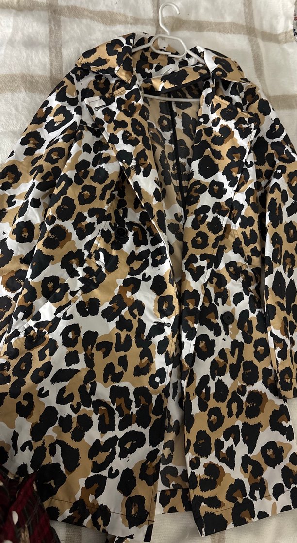 Leopar desenli, uzun ve bol kesim kadın kaban, drapeli tasarımı, çentikli yaka ve askılı kolları ile dikkat çeker. Sentetik kumaştan üretilmiştir.