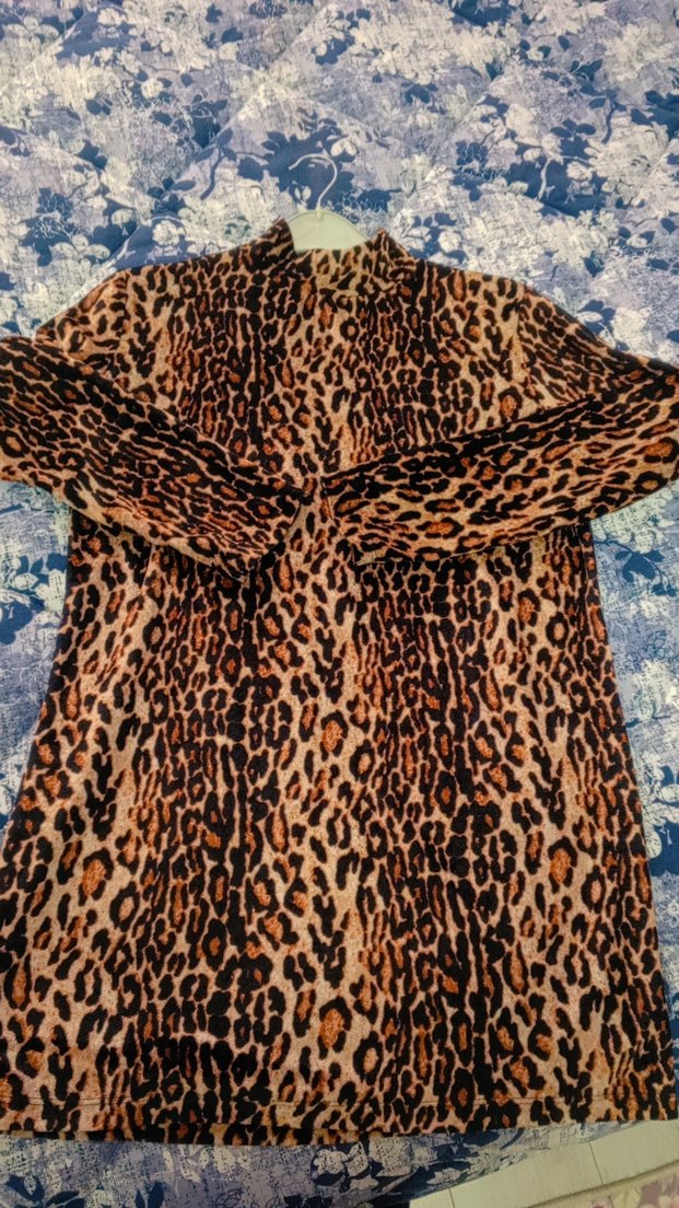 Kahverengi leopar desenli uzun kadın tunik uzun kollu ve boğazlı, kürk detaylı ve rahat kesimle bohem tarzda. hiç bi kusuru yok