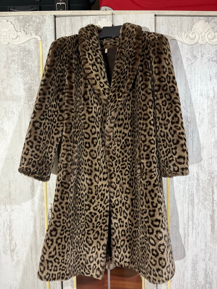 Leopar desenli kahverengi uzun suni kürk, kesik yakalı ve uzun kolludur. Rahat ve bol kesimiyle günlük kullanım için uygundur.