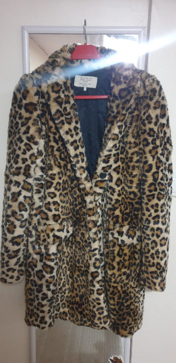 Leopar desenli, suni kürk detaylı, uzun kollu ve normal uzunlukta, suni kumaştan yapılmış bohem tarzda kadın ceketi.