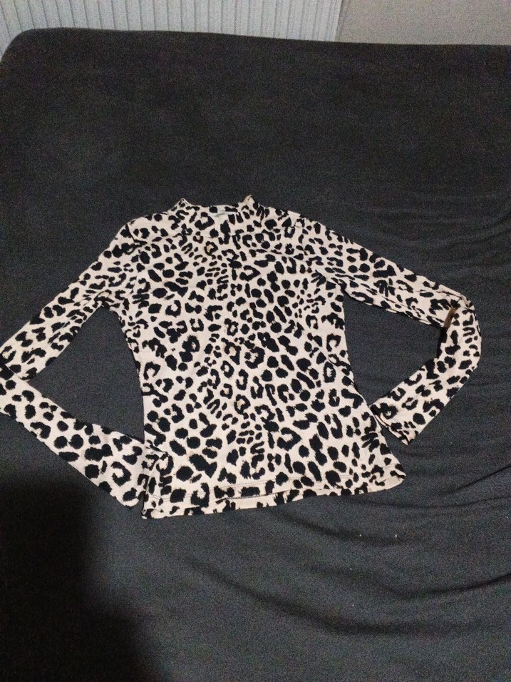 Leopar desenli, uzun kollu ve balıkçı yaka, vücuda oturan sentetik kumaş bluz. Kürk detaylı, midi boyda, günlük kullanıma uygun.