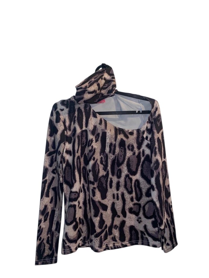 Drapeli boğazlı ve leopar desenli, uzun kollu, bol kesim kahverengi bluz. Yumuşak sentetik kumaştan, rahat dış mekan kullanımı için uygun. S yazıyor ama bence daha çok m-l beden için daha uygun.