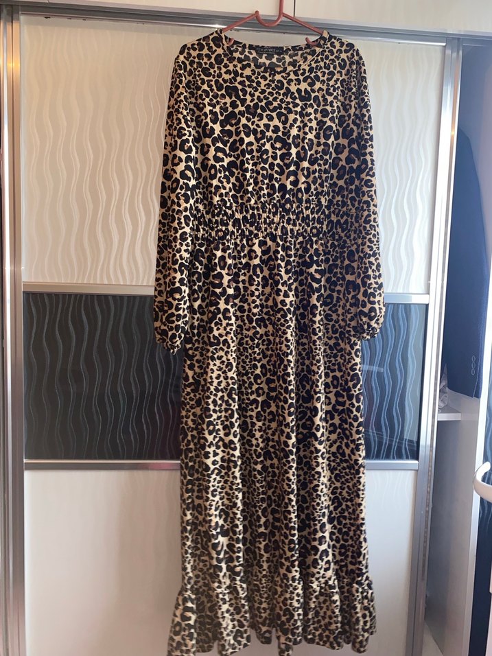 Kahverengi leopar desenli, uzun kollu ve salaş kesim elbise. Yumuşak sentetik kumaştan, bohem tarzda ve günlük kullanıma uygun.