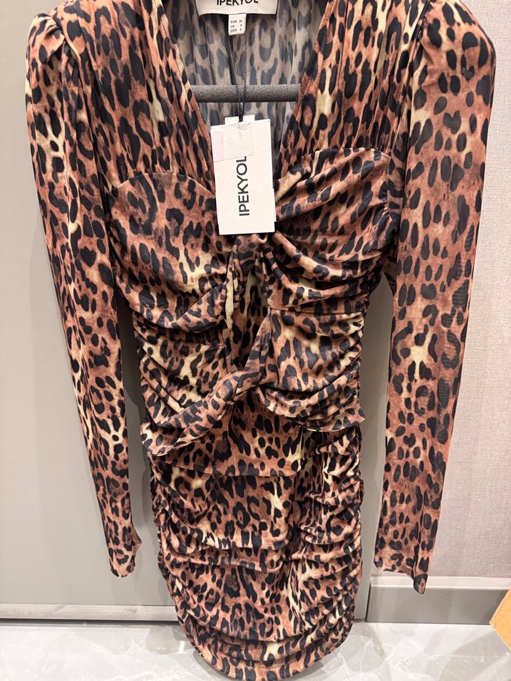 Bu dar kesim uzun kollu elbise, cesur leopar desenli ve V yakalı drapeli tasarıma sahiptir, romantik akşamlar için uygundur.