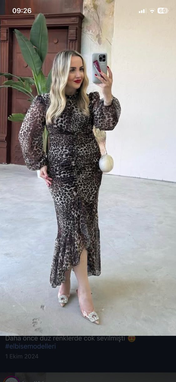 Drapeli tasarıma sahip, yüksek yakalı ve uzun kollu leopar desenli, kahverengi fit kesim uzun elbise. Pürüzsüz sentetik kumaştan, romantik akşamlar için ideal. arkadaşımın kınasında bir kere giydim