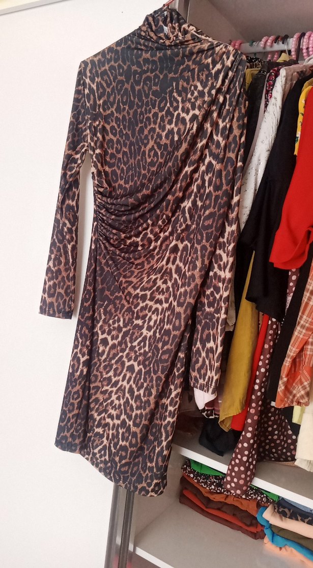 Drapeli, uzun kollu ve V yaka gece elbisesi. Koyu kahverengi leopar desenli, bohem tarzında ve yumuşak sentetik kumaştan yapılmıştır. Günlük kullanım için uygundur.