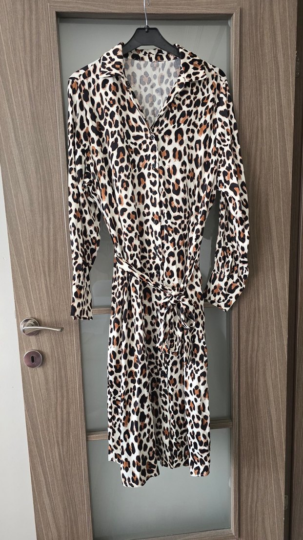 Leopar desenli, uzun kollu, yakalı ve kemerli bol kesim uzun elbise. Yumuşak sentetik kumaştan, bohem tarzda günlük kullanıma uygun. boy 115 gögüs 55 cm dir
