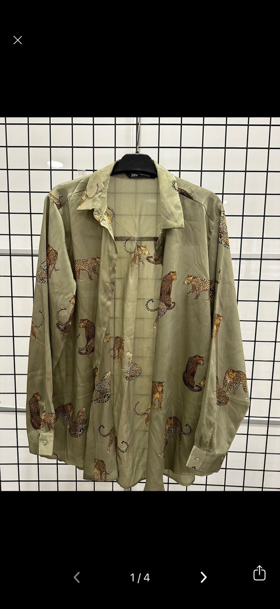 Bohem tarzı, leopar desenli, düğmeli ve uzun kollu kadın gömleği. Rahat kesimli, sentetik yumuşak kumaştan, haki ve gri renklerde.