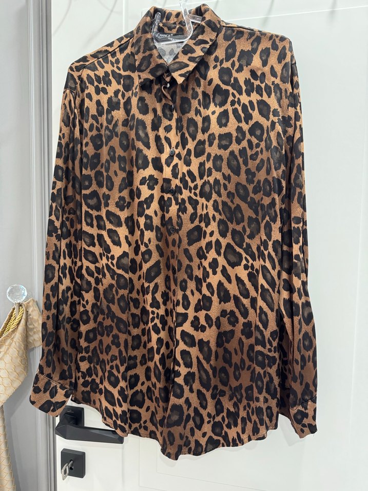 İpek gibi dokusu, leopar desenli koyu kahverengi, uzun kollu, düğmeli, yakalı ve midi boy kadın gömlek. Günlük rahat sokak stiline uygun.