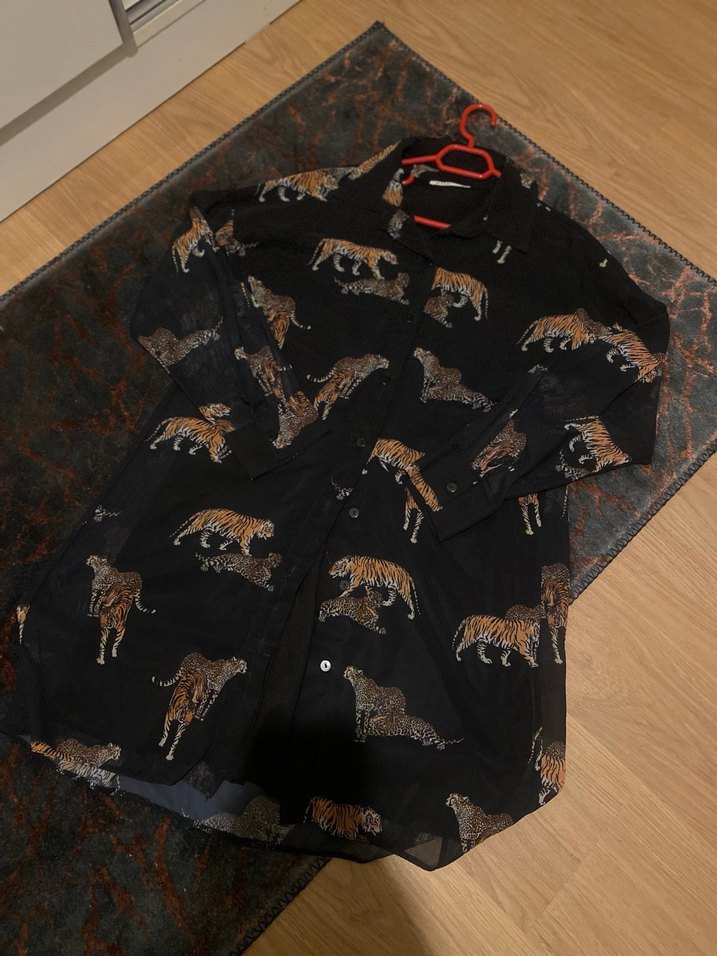 Sentetik kumaştan yapılmış, leopar desenli, uzun kollu, yakalı ve düğmeli, rahat kesim midi uzunluğunda kadın gömleği.