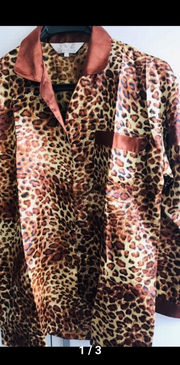Uzun kollu, bol kesim kadın Koyu kahverengi leopar desenli, düğmeli ve yakalıdır. Sentetik kumaştan, bohem ve rahat giyim sıfır ürün