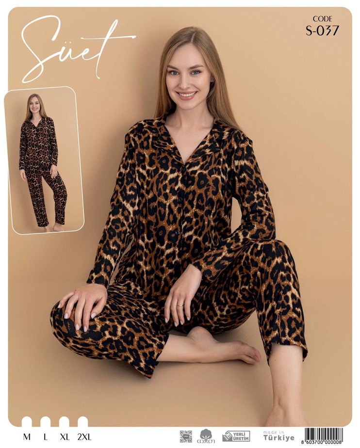 Leopar desenli, uzun kollu, bol kesim kadın pijama takımı. Koyu kahverengi tonlarında, rahat ve konforlu gece giyimi için uygundur.