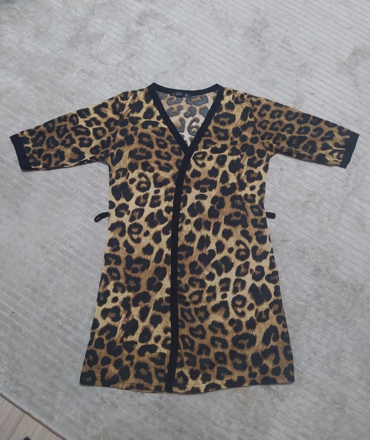 Leopar desenli, uzun kollu, bol kesim kadın sabahlık, koyu kahverengi tonlarında rahat bir sokak tarzı sunar. leopar desenli, kemer yeri var L bedene uygun tertemiz bir kusuru yok hiç giyilmedi iki omuz arası 40 cm iki koltuk altı arası 46 cm boydan 81cm kol boyu 33cm uzunluğunda tertemiz bir kusuru yok