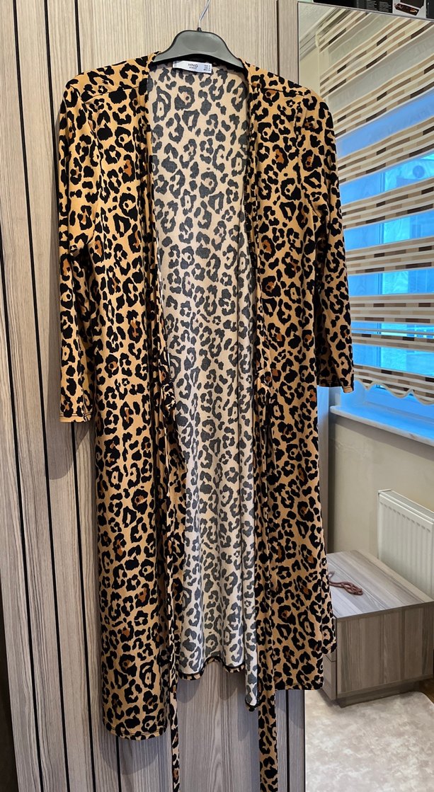 Kısa, bol kesim ve kadın elbise bağlamalı koyu kahverengi leopar desenine sahiptir. Rahat ve sokak tarzına uygun bir üründür.
