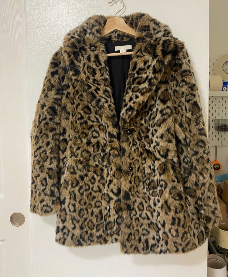 Leopar desenli kahverengi suni kürk, kısa yaka ve uzun kollu. Salaş kesim ve midi boyda, günlük rahat stil için uygun.alt kısmına soba değdi ama belli olmuyor böyle kullandım