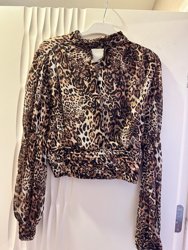 Kahverengi leopar desenli bluz, uzun kollu ve V yakalıdır. Kemer detayı ve kısa kesimiyle bol, modern bir görünüme sahiptir.