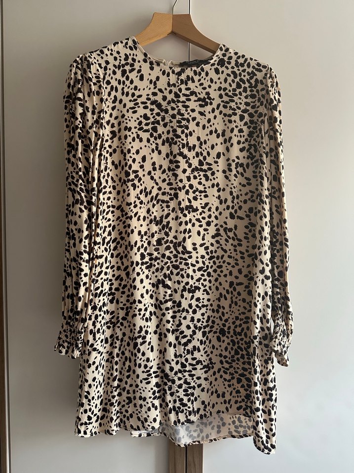 Bej renkli, leopar desenli midi elbise uzun kollu ve bol kesimdir. Yuvarlak yaka ve yumuşak sentetik kumaştır. Beline kemer takarak kullanılabilir.