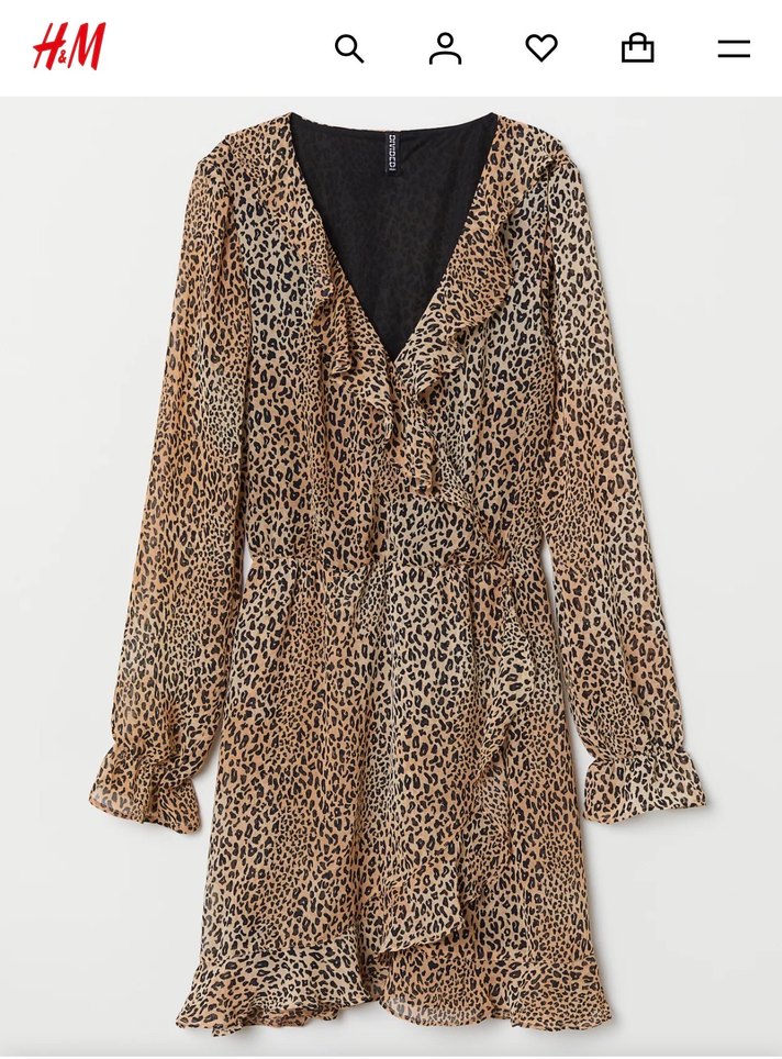 H&M imzalı, leopar desenli, uzun kollu ve midi boyda, vücuda oturan rahat bir kadın elbisesi.