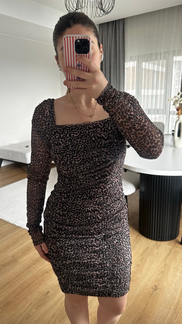 Dar kesim, tekne yaka ve uzun kollu mini elbise. Koyu kahverengi leopar desenli ve drapeli, pürüzsüz sentetik kumaştan yapılmıştır. Romantik akşamlar için uygundur. 1 kez kınada giydim