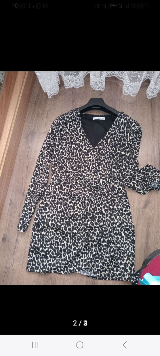 Leopar desenli, uzun kollu, V yakalı ve kürk detaylı dar kesim mini elbise. Sentetik kumaştan, koyu gri renkte, rahat sokak stili için uygun.