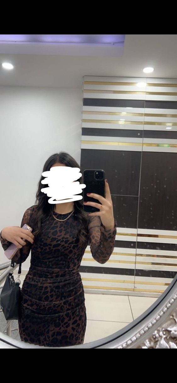 Dar kesim midi boy, yüksek yakalı ve şeffaf uzun kollu, koyu kahverengi leopar desenli sentetik kumaş midi elbise. S M beden uyumludur