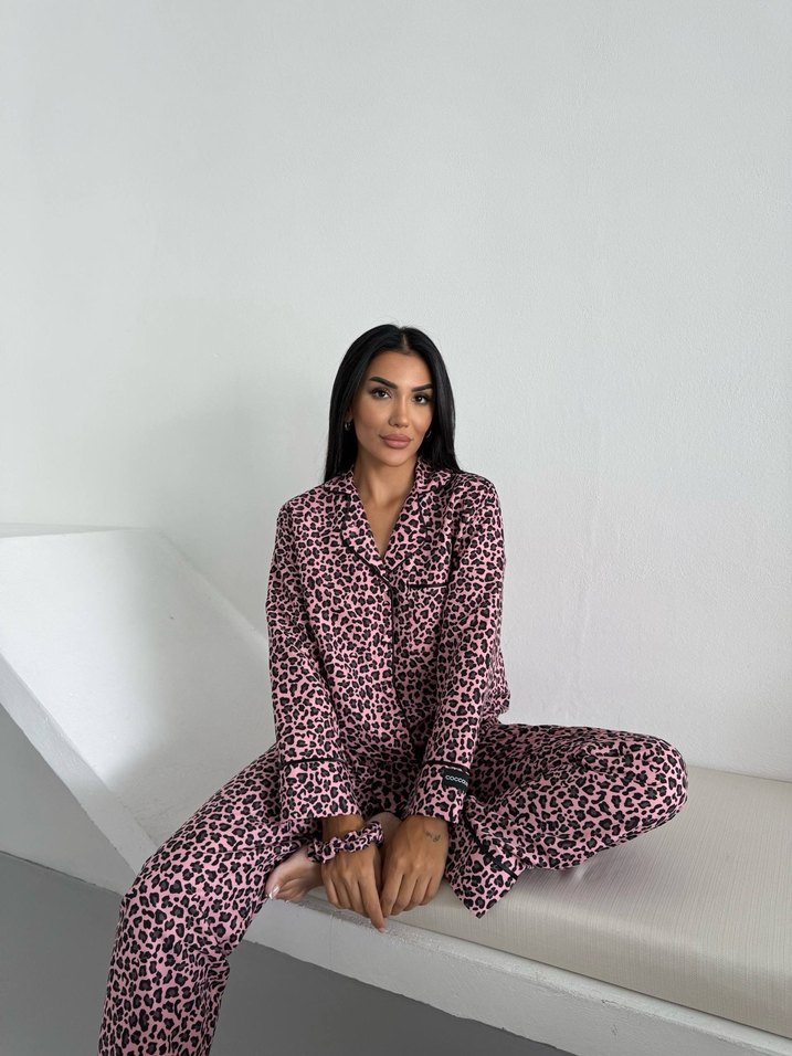 Kadınlar için leopar desenli, uzun kollu ve bol kesim pembe pijama takımı. Rahat ve konforlu kullanım sağlar.