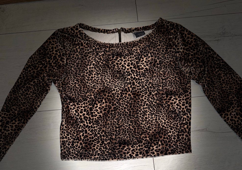 Leopar desenli, uzun kollu, dar kesim kadın bluz. Tekne yaka ve kürk detaylı, koyu kahverengi sentetik kumaştan üretilmiştir.