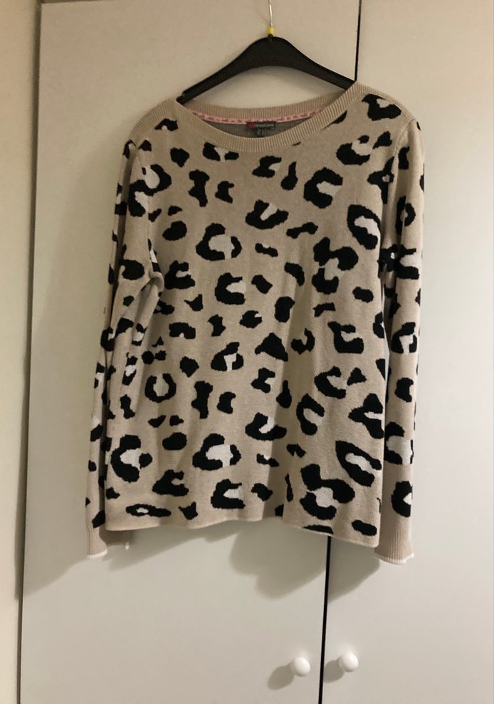 Leopar desenli, uzun kollu, yuvarlak yaka, bol kesim triko kazak. Kahverengi ve gri tonlarda, günlük kullanıma uygun rahat bir sokak stili sunar.