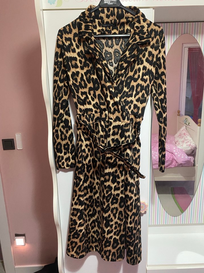 Koyu kahverengi leopar desenli, uzun kollu ve kemerli fit kesim V yaka kadın elbisesi. sokak giyimine uygun şık bir model.