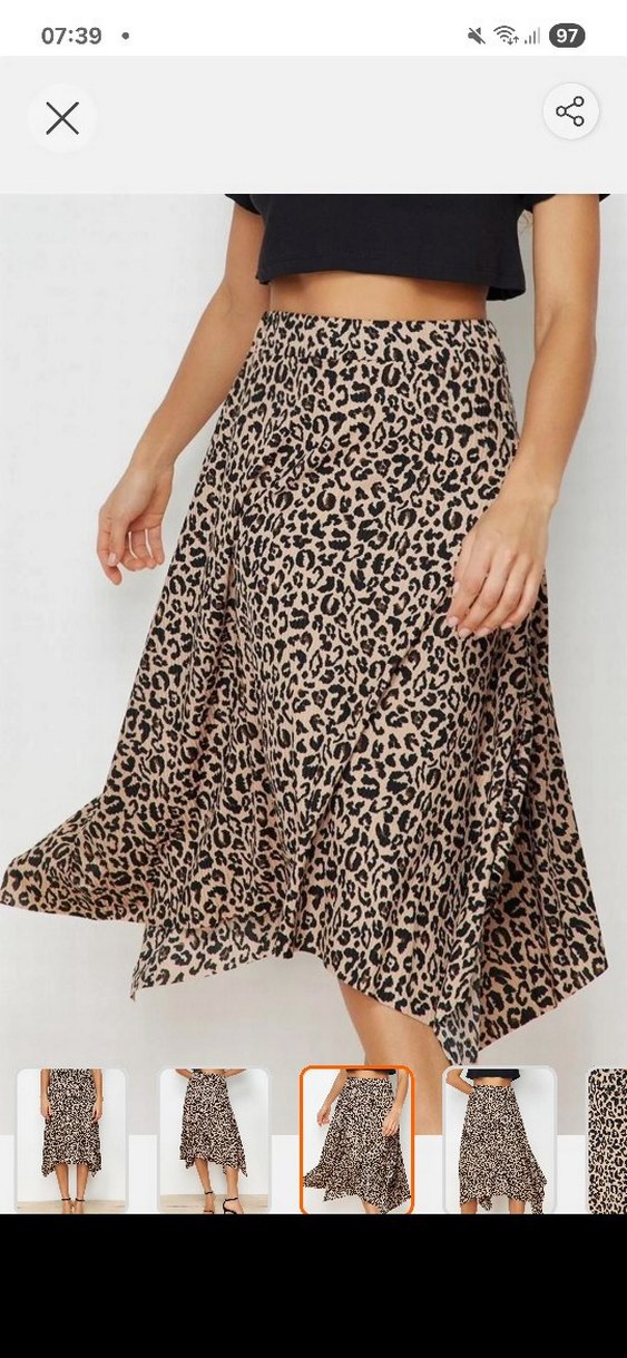 Leopar desenli, kahverengi midi etek, bol kesim ve drapeli tasarımla, yumuşak sentetik kumaştan üretilmiştir. Günlük kullanıma uygundur.